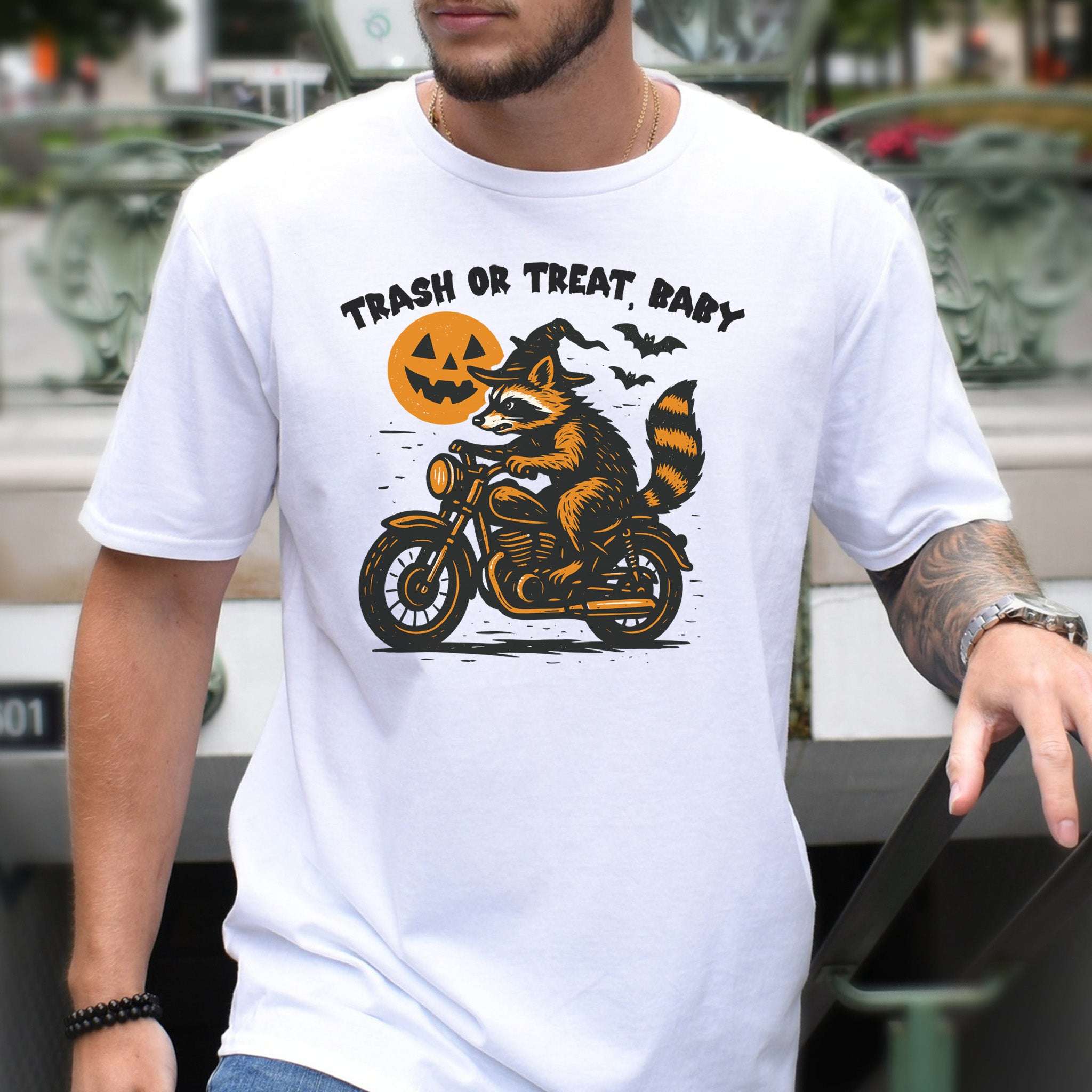 Trash or Treat Raccoon Halloween T-Shirt – Biker Witch Retro Ride Tee