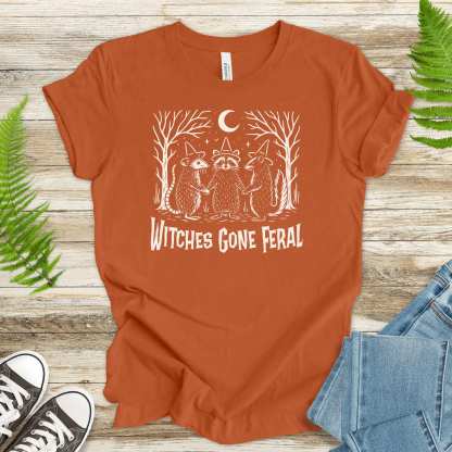 Witches Gone Feral Halloween T-Shirt – Raccoon, Opossum & Skunk Coven Tee